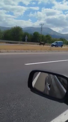 Kesime götürülürken kaçan boğa, karayolunda ters yönden ilerleyerek sürücülere şaşkın anlar yaşattı. O anlar cep telefonu kamerasına yansıdı.