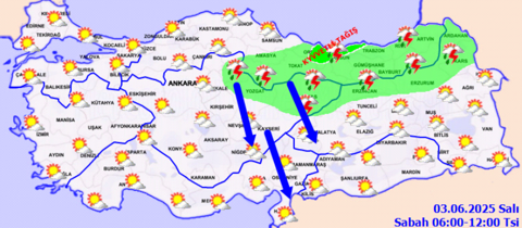 Meteoroloji Genel Müdürlüğü, 3 Haziran Salı gününe ilişkin hava durumu raporunu yayımladı. Rapora göre; Orta Akdeniz’in Toroslar Mevkii, Doğu Akdeniz’in kuzey ve doğusu, İç Anadolu (Eskişehir haric), Orta ve Doğu Karadeniz, Doğu Anadolu’nun kuzeyi ile Van'ın güney ve doğusu, Isparta'nın doğusu, Hatay'ın batısı, Malatya, Bitlis, Hakkari, Muş ve Bingöl çevrelerinin aralıklı sağanak ve gök gürültülü sağanak yağışlı geçeceği tahmin ediliyor.