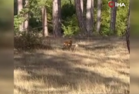 Karabük’te anne karaca, iki yavrusuyla birlikte ormanda görüntülendi. Yol kenarında beliren karacalar bir süre sürücüyü izledikten sonra ağaçların arasına girerek kayboldu.
