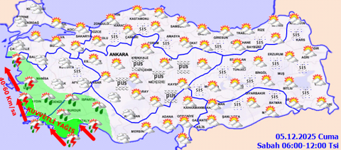 Meteoroloji Genel Müdürlüğü tarafından yapılan tahminlere göre: Ülkemiz genelinin parçalı yer yer çok bulutlu, Marmara'nın güneyi, Ege, Akdeniz, İç Anadolu, Batı ve Orta Karadeniz'in iç kesimleri, Doğu ve Güneydoğu Anadolu'nun batı kesimleri ile Edirne, Kırklareli, Diyarbakır ve Mardin çevrelerinin yağışlı geçeceği tahmin ediliyor. Genellikle yağmur ve sağanak, Ege ve Akdeniz kıyılarında gök gürültülü sağanak, Doğu Anadolu'nun batısının yükseklerinde karla karışık yağmur şeklinde görülecek olan yağışların; Batı Akdeniz, İzmir ve Aydın kıyıları ile Denizli'nin güney ilçelerinde kuvvetli, Antalya ve Muğla çevrelerinde yerel çok kuvvetli ve şiddetli olması bekleniyor. Sabah ve gece saatlerinde iç ve doğu kesimlerde pus ve yer yer sis bekleniyor.