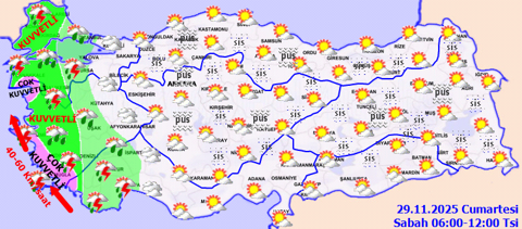 Meteoroloji Genel Müdürlüğü tarafından yapılan tahminlere göre: Yurdun batı kesimlerinin parçalı ve çok bulutlu, Marmara, Ege, Akdeniz, İç Anadolu (Sivas hariç) ile Batı Karadeniz bölgelerinin sağanak ve gök gürültülü sağanak yağışlı, diğer yerlerin az bulutlu geçeceği tahmin ediliyor. Yağışların, Marmara'nın batısı, Ege (Kutahya hariç), Batı Akdeniz ile Mersin çevrelerinde kuvvetli, Ege'nin güney kıyıları ile Edremit Körfezi çevrelerinde yer yer çok kuvvetli olması bekleniyor. İç ve doğu kesimlerde sabah ve gece saatlerinde pus ve yer yer sis hadisesi görüleceği tahmin ediliyor.