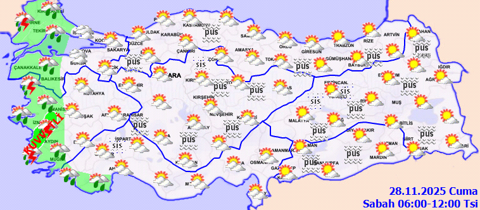 Meteoroloji Genel Müdürlüğü tarafından yapılan tahminlere göre: Ülkemiz genelinin parçalı, yer yer çok bulutlu, Marmara’nın batısı ve Kıyı Ege ile Bursa ve Manisa çevrelerinin sağanak ve yer yer gök gürültülü sağanak yağışlı geçeceği tahmin ediliyor. Yağışların, Kıyı Ege ile Çanakkale, Edirne, Balıkesir ve Manisa çevrelerinde yer yer kuvvetli olması bekleniyor. İç kesimlerde sabah ve gece saatlerinde pus ve yer yer sis hadisesi olacağı tahmin ediliyor.