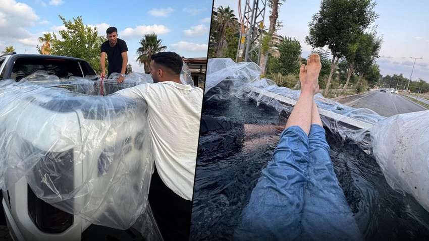 Adana'da yaşayan Ömer Oğuz, geçtiğimiz ay arkadaşlarıyla birlikte aşırı sıcaktan bunalınca aracın kasasını havuza çevirmeyi düşündü. Arkadaşı Mehmet Ali Büdün'ü arayan Oğuz, ‘Annenin salçada kullandığı muşambayı al, göl kenarına gel' dedi. Arkadaşının araması üzerine Büdün, muşambayı alıp göl kenarına gitti ve önce aracın kasasına muşamba gerildi, daha sonra Seyhan Baraj Gölü'nden alınan su ile dolduruldu.