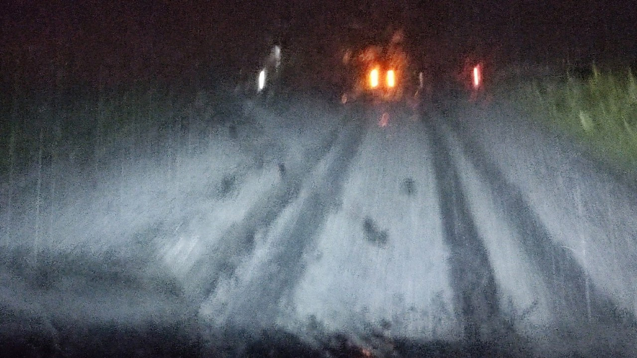 Ardahan'ın Hanak ilçesinde sağanak yağışın ardından etkili olan dolu yağışı, sürücülere zor anlar yaşatırken, karayolu beyaza bürüdü.