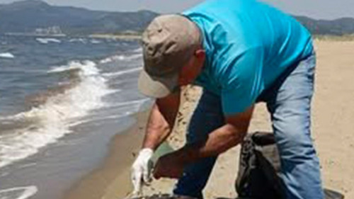 Aydın’ın Kuşadası ilçesi Pamucak Sahili'nde Caretta Caretta cinsi deniz kaplumbağası kıyıya vurmuş şekilde bulundu. EKODOSD Başkanı Bahattin Sürücü, kaplumbağanın baş kısmına aldığı darbe sonucu telef olduğunu ve büyük ihtimalle nefes almak için su yüzeyine çıktığında bir deniz aracıyla çarpıştığını belirtti.