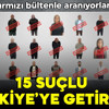Kırmızı bültenle uluslararası seviyede aranan H.K.Ş., F.N., C.B., R.K., S.A., S.Ş., O.K., K.Y., N.G., N.K., A.C., S.A., M.L. ile ulusal seviyede aranan M.A. ve B.B. isimli şahıslar yakalandı ve ülkemize iadeleri sağlandı!