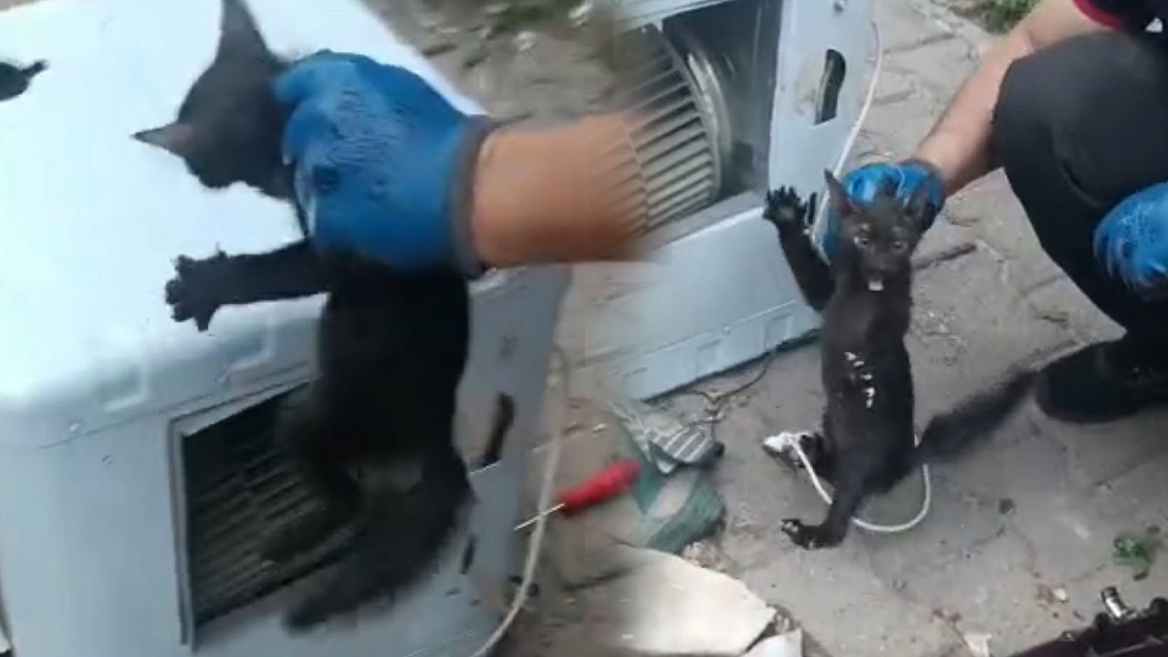 Eve gelen tamirciler, kapaklarını açtıkları klimanın içinde yavru bir kedinin olduğunu fark etti. Kediyi çıkartamayan tamirciler durumu itfaiye ekiplerine bildirdi.