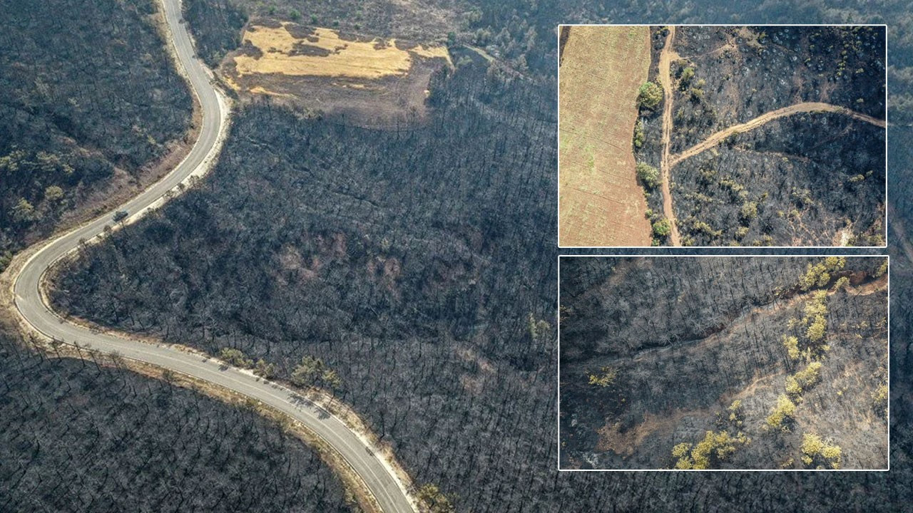 Görüntülerde, ormanlık alanın alevler nedeniyle siyaha bürünmesi yer aldı.