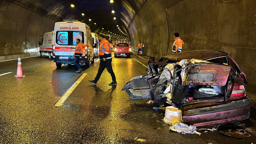 Bolu Dağı Tüneli içerisinde tırla çarpışması neticesinde hurdaya dönen otomobilde bulunan 5 kişi yaralandı.