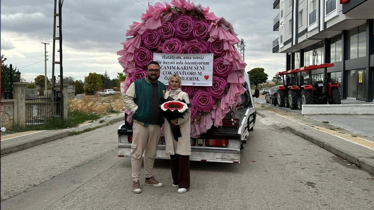 Ankara’nın Akyurt ilçesinde bugün bir vatandaş, eşinden özür dilemek için farklı bir yol denedi ve bir araç çekicisinin arkasına yerleştirilen dev buket çiçek gönderdi.