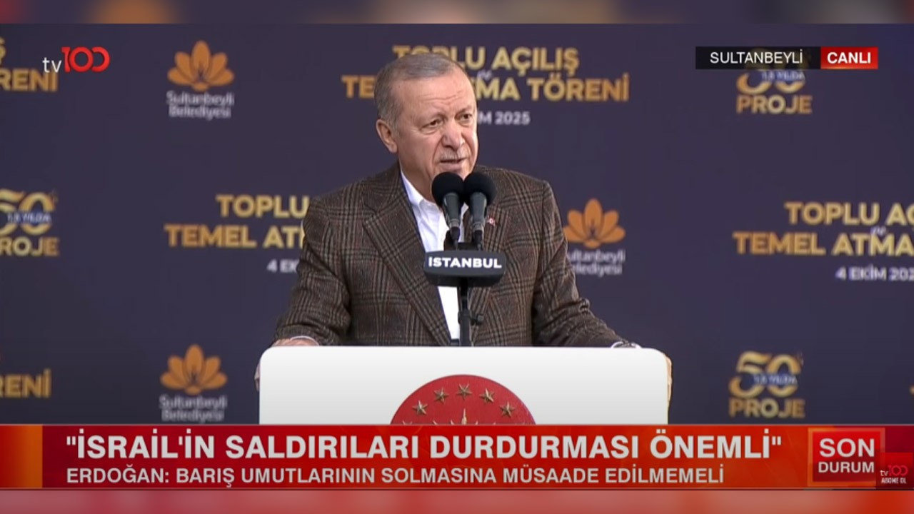 Cumhurbaşkanı Recep Tayyip Erdoğan Sultanbeyli'de Toplu Açılış Töreni'nde konuştu. Erdoğan Sumud yolcularının İstanbul'a geldiğini ifade ederek, "İsrail'in saldırılarını durdurması önemli. Barış umutlarının solmasına müsaade edilmemeli." dedi.