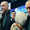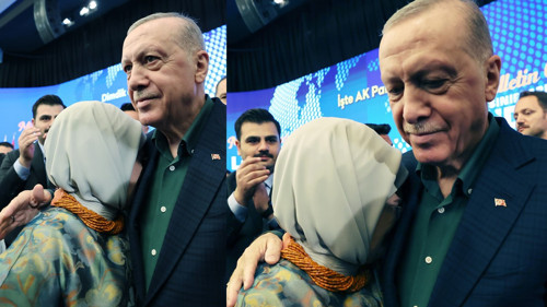 Cumhurbaşkanı Erdoğan konuşması sırasında duygulandığı gözlenen eşi Emine Erdoğan'a sahneden indikten sonra sarıldı.