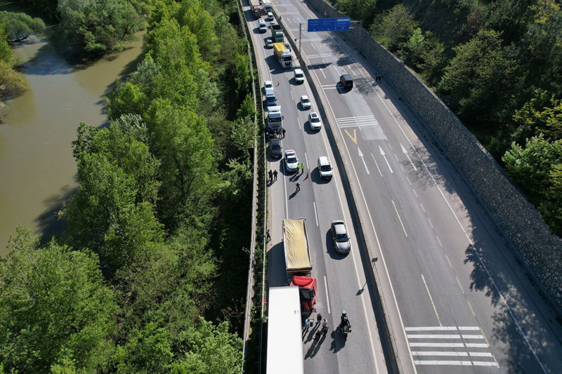 Kazaya ilişkin inceleme başlatılırken, bölgede oluşan trafik yoğunluğu havadan görüntülendi.