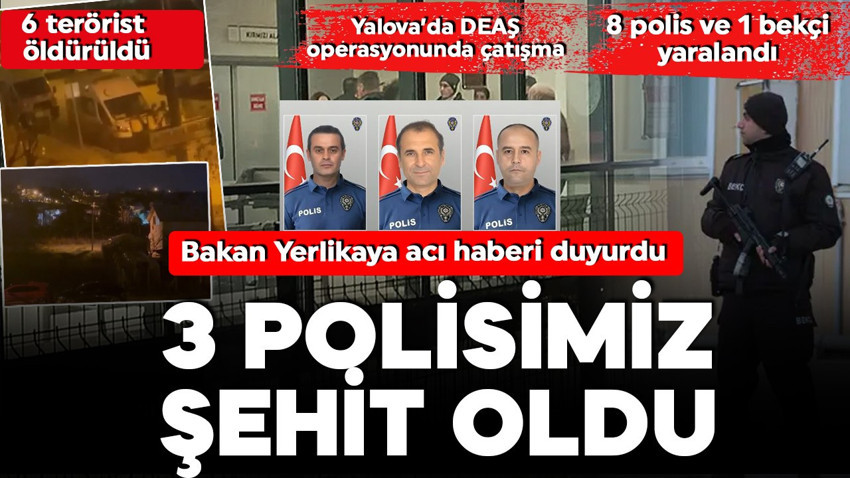 Yalova'da polis ekipleri tarafından yapılan DEAŞ operasyonu sırasında şüphelilerin polise ateş açması sonucu çatışma çıktı. İçişleri Bakanı Ali Yerlikaya 3 polisin şehit olduğunu, 8 polis ve 1 bekçinin de yaralandığını açıkladı. Şehitlerimizin, Yalova İl Emniyet Müdürlüğü emrinde görevli Yasin Koçyiğit, Turgut Külüş ve İlker Pehlivan isimli polis memurları oldukları öğrenildi.