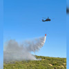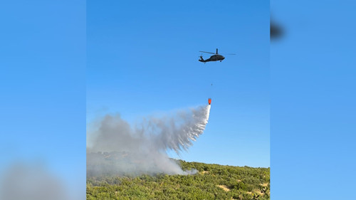 Rüzgarın etkisiyle geniş alana yayılan yangının söndürülmesi için yürütülen çalışmalara iki helikopter de destek veriyor