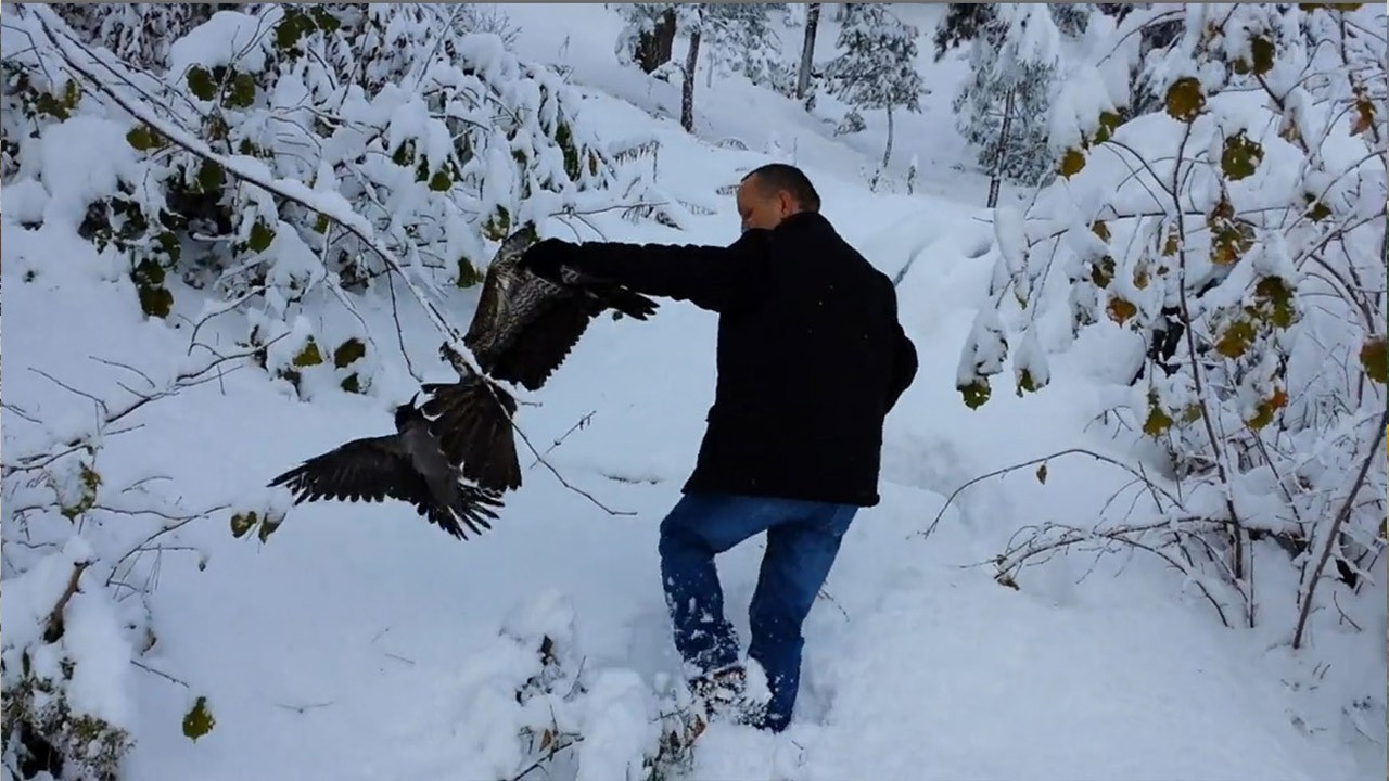 Giresun'un Dereli ilçesi Yavuzkemal beldesinde doğal yaşamda nadir görülen bir olay cep telefonu kameralarına yansıdı. Yavuzkemal Belde Belediye Başkanı Adem Önal, araçla yoldan geçerken yol kenarında karlar içinde bir atmacanın pençelerinden kurtulmaya çalışan ve çığlık atan kargayı fark etti.