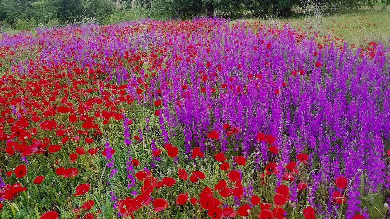 İlçe merkezinde bahar aylarında yağan bol yağmur sonucu Yukarı Bahçe mevkiinde ekilmeyen bir tarlada kırmızı açan gelincik ve mor açan yabani otlar kartpostallık görüntüler oluşturdu.