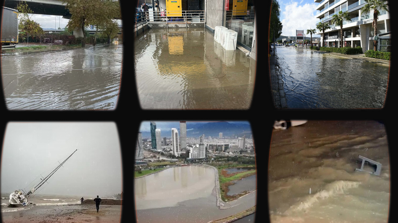 Görüntülerde; kafeteryaya ait bir taburenin sulara kapılıp, sürüklendiği anlar yer aldı. Öte yandan kent merkezinde aralıklarla etkili olan sağanak nedeniyle, kentin en yoğun yerlerinden biri olan Konak ilçesi Kordon boyunda su birikintileri oluştu.