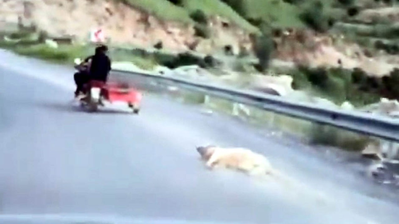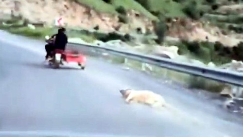 Kentte kaydedilen görüntülerde 2 kişi, kullandıkları sepetli motosikletin arkasına bağladıkları köpekle yolda ilerledi. Köpeğin hareketsiz halde sürüklendiği anlar, arkadan gelen otomobildeki kişi tarafından cep telefonuyla kayda alındı. Görüntüleri kaydeden kişi, motosikletin yanında durup, "Gençler ne yapıyorsunuz? Yazık günah değil mi?" diye tepki gösterdi. Motosikletin sürücü ise "Öldü" diye yanıt verdi.
