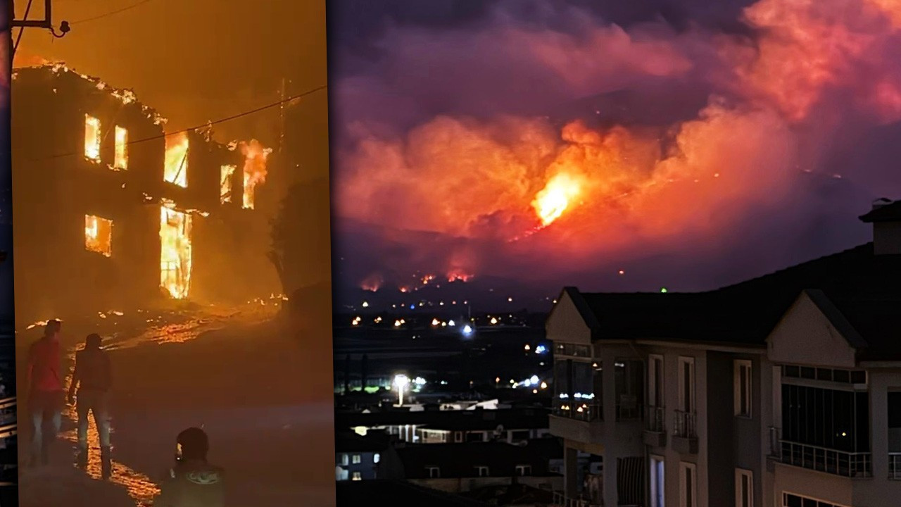 Orman yangını, rüzgarın da etkisiyle hızla yayıldı.Alevler, tahliye edilen Taşoluk Mahallesi’ne sıçradı. Mahallede bulunan evler alev topuna döndü.