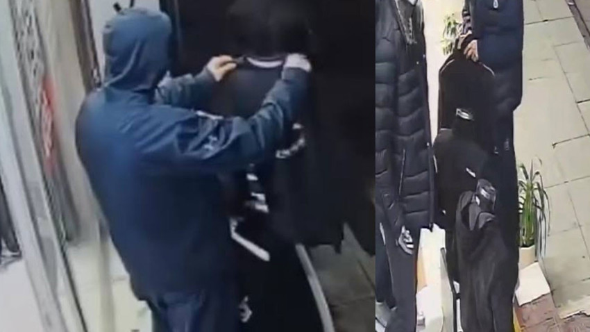Bu sırada kız arkadaşı da askıdaki bir elbiseyi alıp uzaklaştı. Hırsızlık anları, iş yerlerinin güvenlik kameralarına yansıdı.